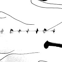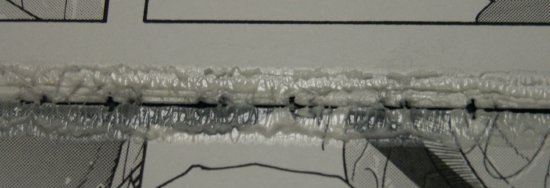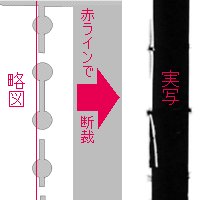 | 断裁機を使うと綺麗に一直線に切断できそうですが、4−1で説明 した補強の為の穴に、針のような紙屑ができてしまいます。 これは閉じた穴に製本糊が盛り上がるように付着しているので、 断裁した際に微妙に位置ズレが起って作られます。 この紙屑は断裁時の圧力で溶けた製本糊により付着しているだけ なので取れ易く、スキャン時には原稿台の上に落ちてスクリーン トーンの模様を崩す原因になります。 |